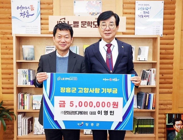 [위키트리 광주전남취재본부 노해섭 기자]이영민 ㈜문화공방디케이비 대표가 1월 29일 장흥군에 고향사랑기부금 500만 원을 기탁하며 고향 발전에 깊은 애정을 표했다.