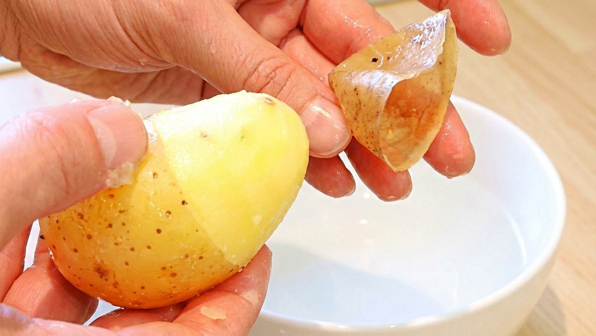 이 상태에서 감자의 양끝을 잡고 칼집이 난 방향으로 살짝 비틀듯 당기면 껍질이 매끈하게 분리된다. 한쪽에서 잡아당기면 반대쪽까지 한 번에 벗겨진다. 손에 힘을 줄 필요도 거의 없다.