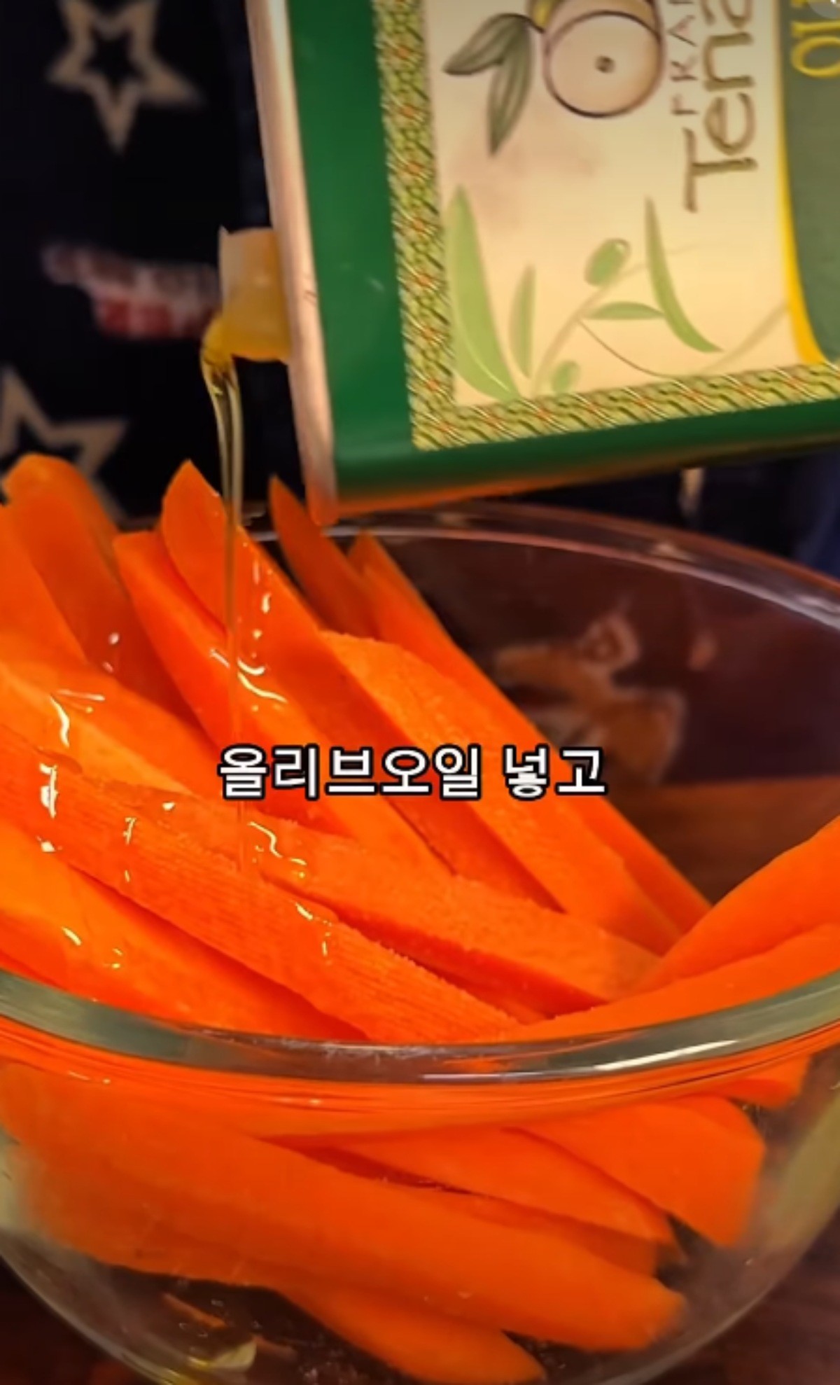먼저 당근은 1cm 두께로 길쭉하게 썰어준다. 이후 소금 2꼬집, 알룰로스 1스푼, 올리브오일 1스푼 넣고 골고루 버무려 준다.