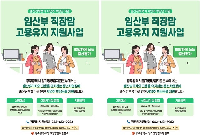 광주광역시 일가정양립지원본부는 오는 10일 오전 9시부터 ‘임산부 직장맘 고용유지 지원사업’ 참여 기업을 모집한다고 6일 밝혔다.
