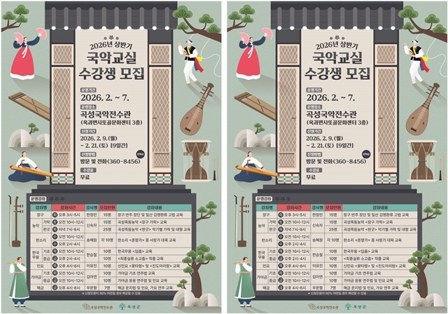 [위키트리 광주전남취재본부 노해섭 기자]전남 곡성군은 곡성국악전수관에서 운영하는‘2026년 상반기 국악교실’수강생을 모집한다고 6일 밝혔다.