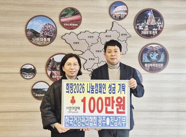 전남 함평군은 “지난 9일 한국건강관리협회 광주전남지부가 설 명절을 맞아 지역 취약계층 지원을 위한 사랑의 성금 100만 원을 기탁했다“고 10일 밝혔다.
