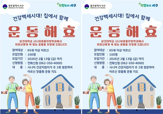 김이강 서구청장은 “이번 운동해효 사업을 통해 어르신들이 가정에서 안전하고 정기적인 운동 지도를 받으며 건강한 노후를 보내시길 바란다”며 “앞으로도 어르신들이 지역사회 안에서 건강하고 행복한 삶을 누릴 수 있도록 다양한 통합돌봄 서비스를 지속적으로 확대하겠다”고 말했다.