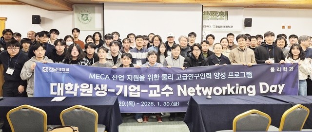 12일 전남대에 따르면, 전남대학교 물리학과(학과장 문걸)는 ‘RISE사업’의 일환으로 지난 1월 29일부터 30일까지 1박 2일간 무주 덕유산리조트에서 MECA 산업 지원을 위한 물리 고급연구인력 양성을 목적으로 ‘대학원생(신진연구인력 포함)–기업 재직자(임·직원)–교수진 정기 Networking Day’를 성황리에 개최했다.