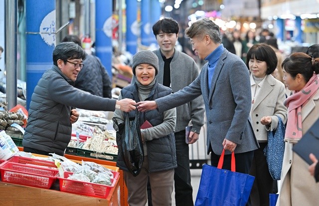 [위키트리 광주전남취재본부 노해섭 기자]김이강 광주시 서구청장이 12일 민족 대명절 설을 앞두고 양동전통시장에서 전통시장 활성화 및 상권 회복을 위해 온누리상품권으로 제수용품 등을 구입하고 있다. 광주 서구 제공