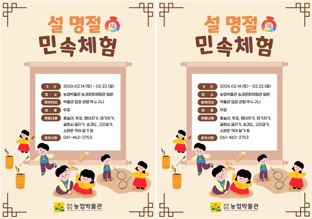 김옥경 전남도농업박물관장은 “설 민속 체험행사는 세대가 함께 참여해 전통문화를 몸으로 익히고 즐기도록 구성했다”며 “농업박물관을 찾아 가족과 함께 따뜻한 명절의 정을 느끼고, 전통의 가치를 되새기는 시간이 되길 바란다”고 말했다.