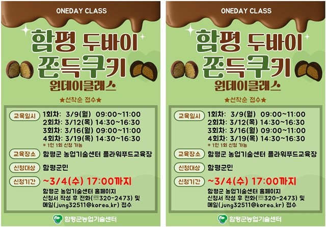 함평군 농업기술센터는 오는 3월 4일까지 ‘두바이 쫀득쿠키 만들기’ 원데이 클래스 교육생을 모집한다고 13일 밝혔다.