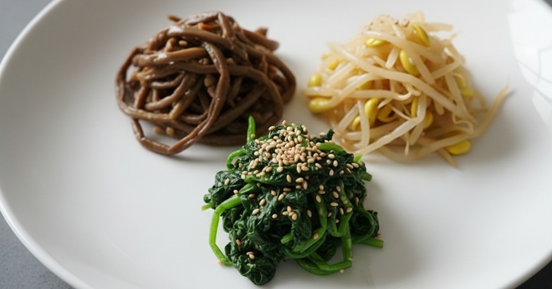 먼저 도라지는 가늘게 찢어 소금물에 바락바락 주물러 쓴맛을 제거한다. 이후 흐르는 물에 여러 번 헹군 뒤 물기를 빼고, 끓는 물에 소금을 약간 넣어 2분 정도 데친다. 너무 오래 삶으면 질겨질 수 있으니 시간을 지키는 것이 좋다. 고사리는 미리 불려 삶아 둔 것을 사용한다. 질긴 줄기 부분은 제거하고 먹기 좋은 길이로 자른다. 콩나물은 뿌리를 정리한 뒤 깨끗이 씻어 체에 밭쳐 둔다.