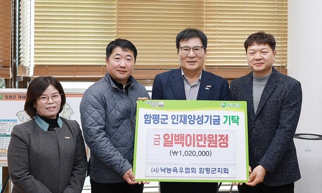 19일 전남 함평군은 지난 13일 한국낙농육우협회 함평군지회가 군청을 방문해 인재양성기금 102만 원을 기탁했다고 밝혔다.