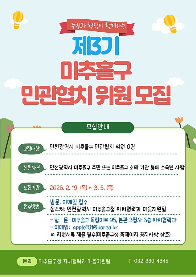 인천 미추홀구(구청장 이영훈)는 주민과 행정이 함께 지역 현안을 논의하고 해결하는 협치 기반을 강화하기 위해 제3기 민관협치위원회 위원을 공개 모집한다고 밝혔다.