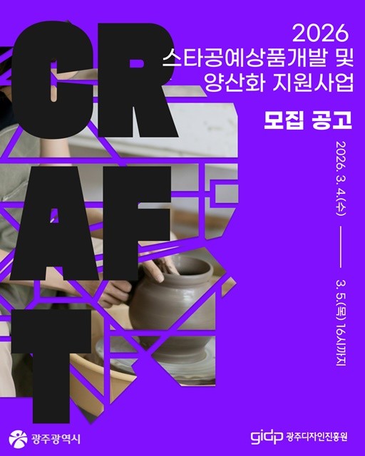 [위키트리 광주전남취재본부 노해섭 기자] 광주디자인진흥원(원장 김용모)은 현대적이고 독창적인 공예상품개발을 지원하기 위해 ‘2026 스타공예상품개발 및 양산화지원사업’을 오는 2월 12일부터 시행하고 접수한다고 밝혔다.