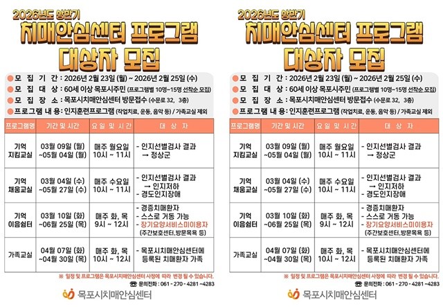 모집기간은 2월 23일부터 25일까지이며, 대상은 60세 이상 목포시민이다. 프로그램별로 10~15명을 선착순 모집하며, 신청은 목포시 치매안심센터(수문로 32, 3층)를 방문하거나 전화로 접수하면 된다.