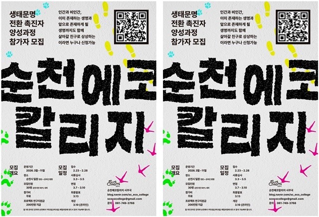 [위키트리 광주전남취재본부 노해섭 기자]순천시(시장 노관규)는 ‘2026년 순천에코칼리지 생태문명전환 촉진자 양성과정’ 참가자를 모집한다고 밝혔다. 이번 과정은 오는 3월부터 11월까지 운영되며, 모집인원은 30명으로 거주지역과 연령 제한 없이 국내외 누구나 지원할 수 있다.