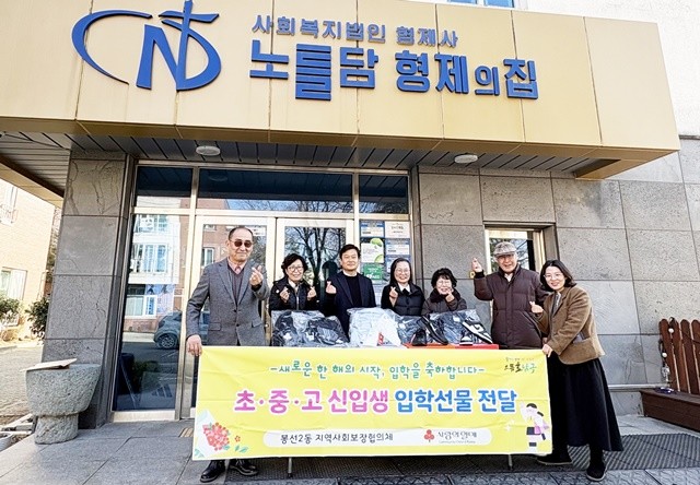 [위키트리 광주전남취재본부 노해섭 기자]광주시 남구 봉선2동 지역사회보장협의체(위원장 윤성운)는 20일 관내 아동복지시설 초·중·고 신입생 9명에게 운동화, 책가방 등 입학선물을 전달했다.