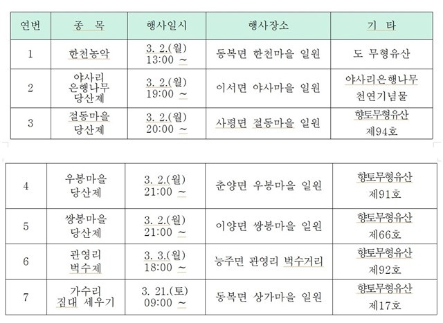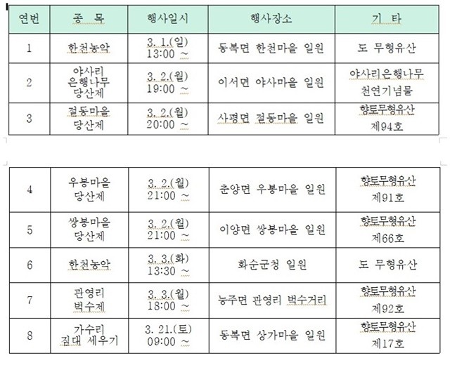 전통 민속행사는 화순군 관내 7개의 면에서 각각 개최되며, 행사 종목과 개최 날짜 등 세부 내용은 아래 표를 참고하면 된다.