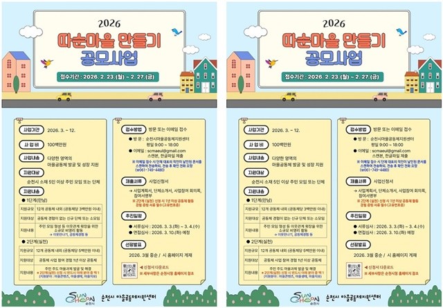 [위키트리 광주전남취재본부 노해섭 기자]순천시(시장 노관규)는 주민 주도의 마을문제 해결과 마을공동체 발굴․성장을 지원하기 위해 「2026년 따순마을 만들기 공모사업」 참여자를 모집한다고 밝혔다.