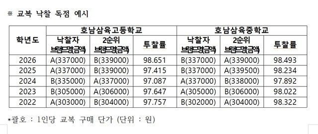 특히 2026학년도 교복 입찰에서 해당 학교들의 낙찰 투찰률은 무려 98%에 달해 광주 지역 최고 수준을 기록했다. 이는 과거 법원이 유죄로 판단했던 조직적 담합 구조와 매우 유사하다는 것이 시민모임 측의 설명이다.