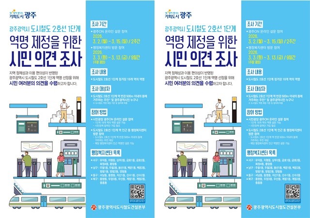 이번 조사는 ‘도시철도 역명 제정 기준 및 절차 추진 계획’에 따라 진행된다. 광주시민 누구나 온라인 시민참여 플랫폼 ‘광주온(ON)’을 통해 참여할 수 있으며, 각 역사 반경 500m 이내 주민은 행정복지센터에 비치된 설문지를 통해 거주지 인근 정거장 역명에 대한 의견을 오프라인으로도 제출할 수 있다.