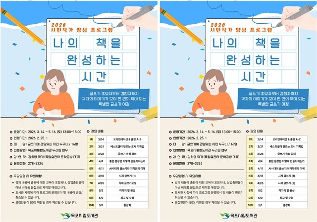 프로그램은 3월 14일부터 5월 16일까지 매주 토요일 총 10회 운영되며, 모집 인원은 목포시민 16명이다. 접수는 2월 25일부터 목포시통합도서관 누리집에서 선착순으로 진행된다.