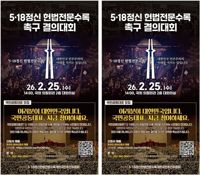 추진위는 결의문을 통해 정치권에 ▲6·3 지방선거와 연계한 ‘원포인트 개헌’ ▲국민투표법 개정 ▲국회 개헌특별위원회 즉각 구성 ▲5·18 역사 왜곡 처벌 조항 강화(5·18 특별법) ▲5·18 정신 계승 후속 법 제정 등을 강력히 요구할 계획이다.