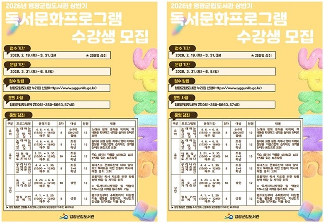 [위키트리 광주전남취재본부 노해섭 기자]영광군(군수 장세일)은 오는 3월 21일부터 군민의 독서 역량 강화와 평생학습 기회 확대 지원을 위해“2026년 영광군립도서관 상반기 독서문화 프로그램”을 운영한다고 밝혔다.