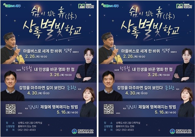 김선아 도서관과장은 “상록별빛학교는 단순한 강연을 넘어 주민이 스스로를 돌보고 쉼을 경험하도록 기획한 프로그램”이라며 “책과 사람, 이야기가 만나는 상록별빛학교에 많은 관심과 참여를 바란다”고 말했다.