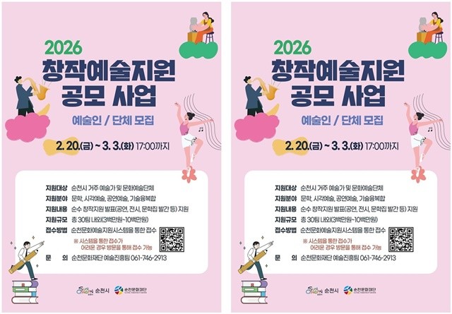 [위키트리 광주전남취재본부 노해섭 기자](재)순천문화재단이 오는 3월 3일까지 ‘2026 창작예술지원 공모사업’ 참여 예술인(단체)을 모집한다.