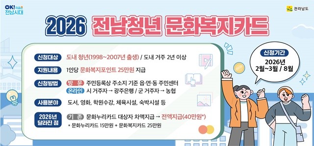 [위키트리 광주전남취재본부 노해섭 기자] 전라남도(도지사 김영록)가 지역 청년의 문화 향유와 자기계발 기회를 넓히기 위해 19~28세 청년에게 연 25만 원을 지원하는 ‘전남 청년 문화복지카드’ 신청을 3월 말까지 접수한다.