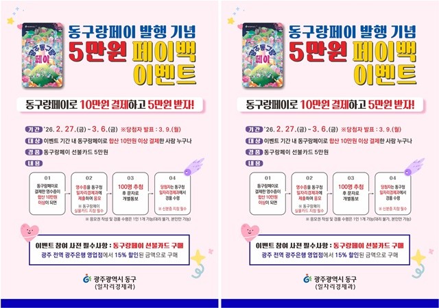 한편 동구랑페이 선불카드는 지난 23일 발행을 시작했으며, 광주 전역 광주은행 영업점에서 15% 할인된 금액으로 구매할 수 있다. 동구는 이번 페이백 이벤트가 지역경제 활성화에 긍정적인 효과를 가져올 것으로 기대하고 있다.