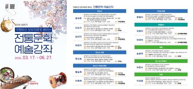 [위키트리 광주전남취재본부 노해섭 기자]광주문화재단 전통문화관은 청소년을 비롯하여 시민 누구나 참여할 수 있는 ‘2026 상반기 전통문화예술강좌’ 수강생을 모집한다.