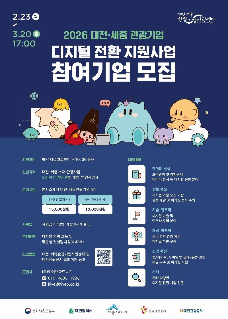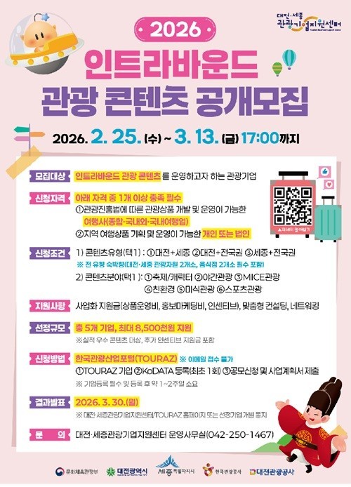 [위키트리 대전=김지연 기자] 대전관광공사는 대전·세종 지역과 전국 관광자원을 연계한 숙박형 관광 콘텐츠를 발굴하기 위해 ‘2026 대전·세종 인트라바운드 관광 콘텐츠’를 공개 모집한다고 25일 밝혔다.