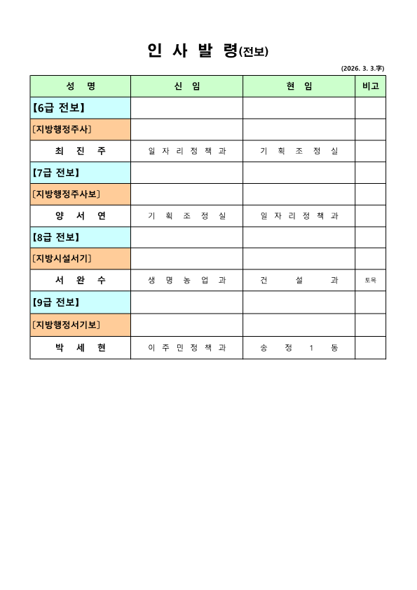광주시 광산구(구청장 박병규)는 3월3일자로 승진 및 전보인사를 단행했다.