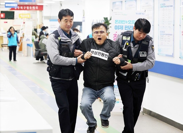 [위키트리 광주전남취재본부 노해섭 기자]25일 광주시 북구청 민원실에서 폭언·폭행 등 민원실 비상 상황 대비 경찰 합동 모의훈련과 공무방해자 출입제한·퇴거조치 상황교육이 실시되고 있다. 사진은 경찰 입회하에 악성민원인 퇴거조치 상황이 진행되고 있다.