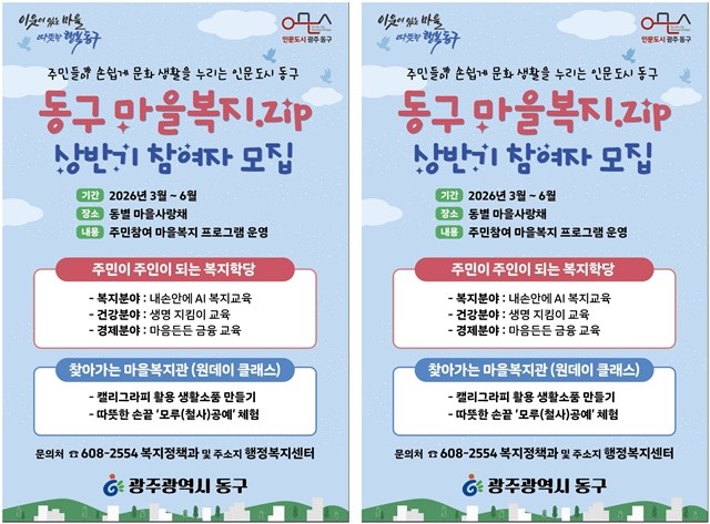 [위키트리 광주전남취재본부 노해섭 기자]광주시 동구는 주민 누구나 일상 속에서 복지를 배우고 참여할 수 있는 ‘동구 마을복지.ZIP’ 사업을 오는 3월부터 본격 추진한다고 밝혔다.