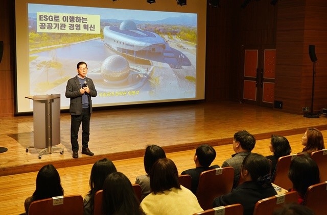 [위키트리 광주전남취재본부 노해섭 기자] 광주문화재단은 2월 24일 국립광주과학관 이정구 관장을 초청해 ‘ESG로 이행하는 공공기관 경영 혁신’ 특강을 진행했다. 이번 특강은 기후위기와 사회적 갈등 속에서 공공기관이 나아가야 할 올바른 방향을 찾고 재단 ESG 경영의 실천역량 강화를 위해 추진됐다.