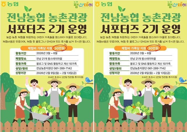 [위키트리 광주전남취재본부 노해섭 기자]농협전남본부(본부장 이광일)는 26일 전남팜스테이마을협의회(회장 심재운)와 함께 농업·농촌체험을 희망하는 어린이 10가족을 선정해 본격적인 농촌관광 서포터즈 활동을 3월 1일부터 시작한다고 밝혔다.