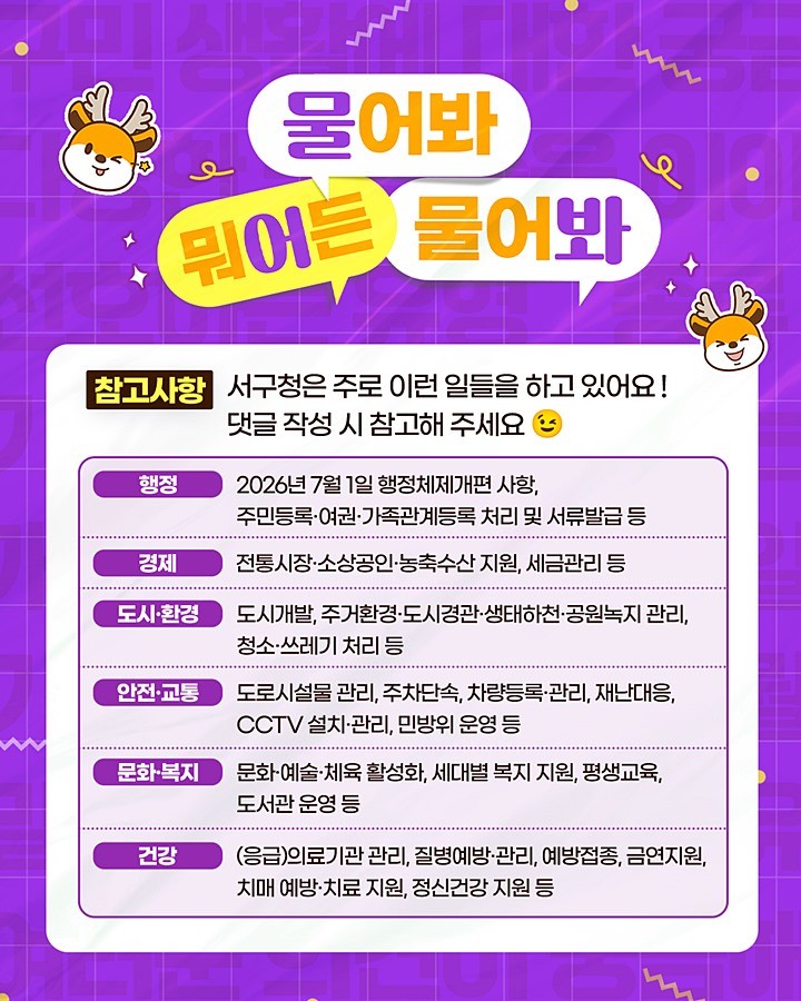 서구 관계자는 “이번 캠페인은 구민과의 소통을 강화할 수 있는 특별한 기회”라며 “다가오는 하반기에도 댓글을 통해 질문을 받을 예정이니 지속적인 관심과 참여를 부탁드린다”라고 말했다.