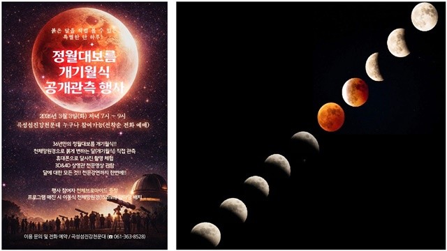 곡성군 관계자는 “정월대보름과 개기월식이 겹치는 특별한 날, 지역주민과 관광객이 함께 밤하늘의 감동을 나누는 올해 가장 특별한 시간이 되길 바란다.”라고 말했다.