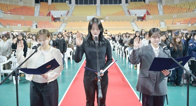특히 신입생 대표로 나선 김하은(스포츠재활학과), 편입생 대표 이소민(스포츠학과), 대학원생 대표 백다빈(일반대학원 상담임상심리학과) 학생은 단상에 올라, 대학 구성원으로서 학업에 정진하고 건전한 대학 문화를 만들어가겠다고 선서해 큰 박수를 받았다.