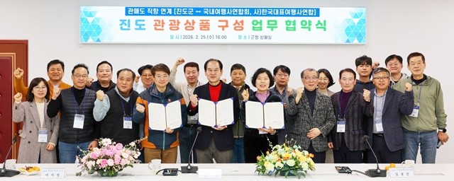 진도군은 지난 25일에 진도군청에서 국내여행사연합회, 한국대표여행사연합과 함께 ‘관매도 직항 연계 진도 관광상품 구성’을 위한 업무협약(MOU)을 체결했다.