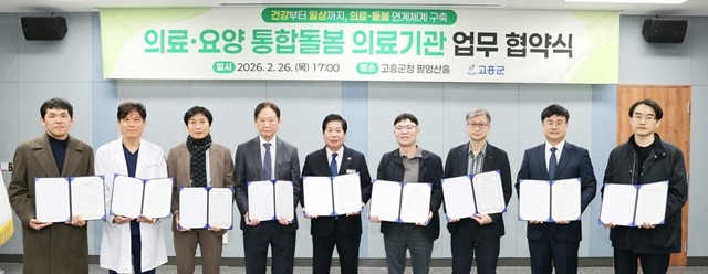 [위키트리 광주전남취재본부 노해섭 기자]고흥군(군수 공영민)은 지난 26일 군청 팔영산홀에서 지역 내 18개 의료기관과 함께 의료·돌봄 연계체계 구축을 위한 통합돌봄사업 의료분야 업무협약을 체결했다.