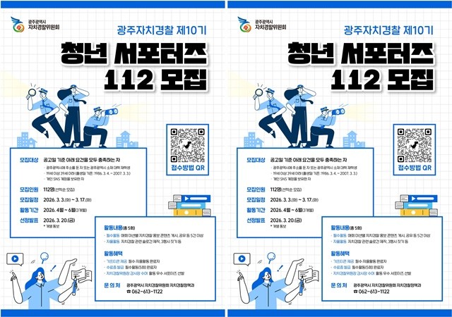 광주광역시 자치경찰위원회(위원장 안진)는 오는 3일부터 17일까지 ‘제10기 청년 서포터즈 112’ 활동에 참여할 청년 112명을 모집한다고 2일 밝혔다.