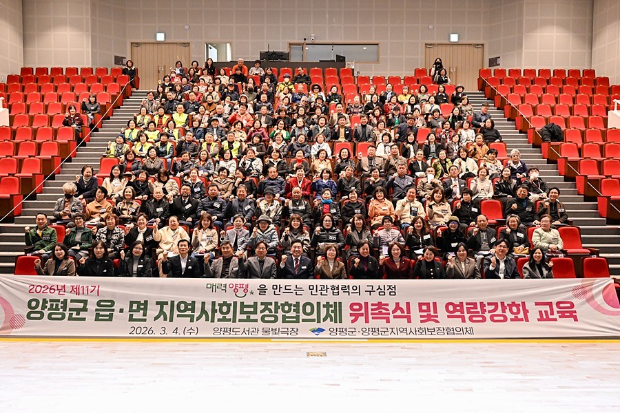 경기 양평군(군수 전진선)은 지난 4일 양평도서관 물빛극장에서 250여 명이 참석한 가운데 ‘2026년 제11기 읍면 지역사회보장협의체 위촉식 및 역량 강화 교육’을 개최하고, 지역 맞춤형 복지안전망 강화를 위한 본격적인 활동에 들어갔다고 밝혔다.