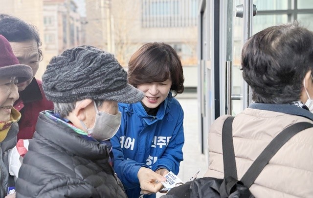 황경아 예비후보는 지난 4일 오전 광주 남구 문화예술회관 대공연장에서 열린 ‘2026 상반기 노인일자리 참여자 통합 교육’ 현장을 찾아 어르신들과 소통하며 지지를 호소했다.
