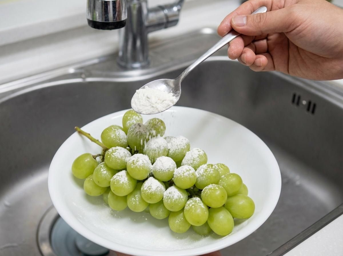 포도 위에 부침가루를 골고루 뿌린 뒤 약 5~10분 정도 둔다. 가루 입자가 과일 표면의 먼지와 이물질을 붙잡는 역할을 한다. 이후 흐르는 물에 씻어내면 가루와 함께 이물질이 떨어지는 방식이다. 다만 세척 후에는 가루가 남지 않도록 충분히 헹구는 것이 중요하다.