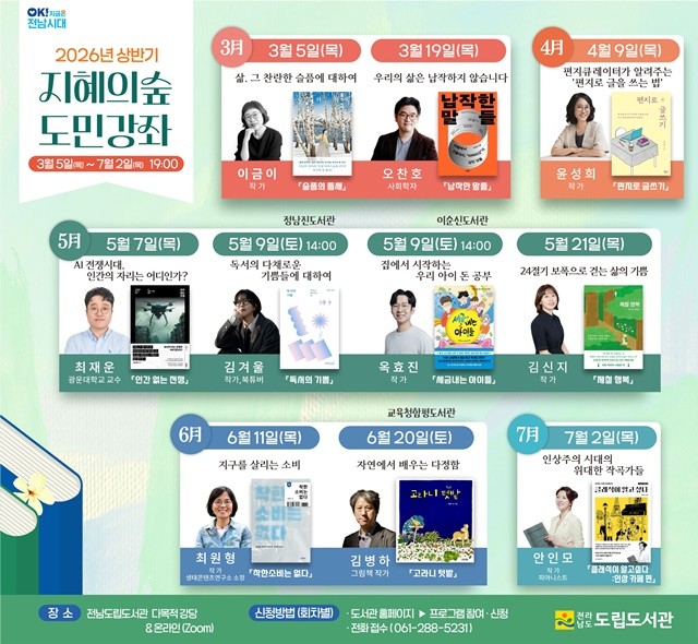 조병섭 전남도립도서관장은 “도민강좌는 책과 사람, 삶을 연결하는 인문학 프로그램”이라며 “도민이 강연을 통해 일상에서 인문학의 즐거움을 느끼길 바란다”고 말했다.