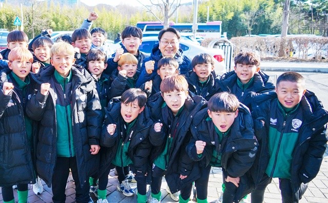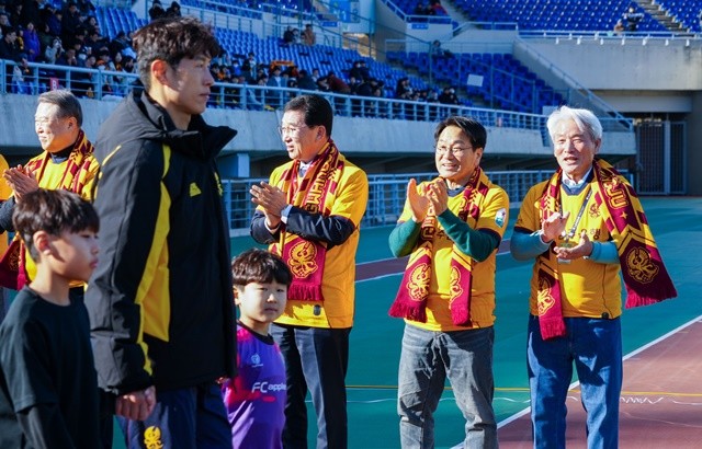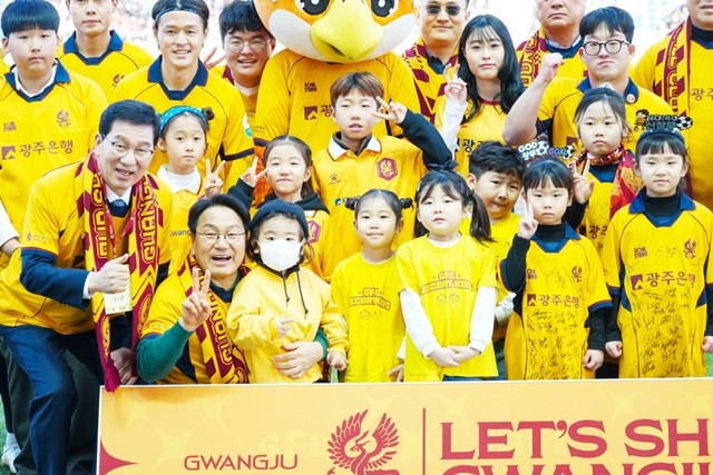 [위키트리 광주전남취재본부 노해섭 기자]강기정 광주광역시장이 7일 오후 광주월드컵경기장에서 열린 광주FC와 인천 유나이티드의 2026시즌 K리그1 홈 개막전에 참석해 송정서FC 선수단과 광주FC 승리를 기원하고 있다./광주광역시 제공