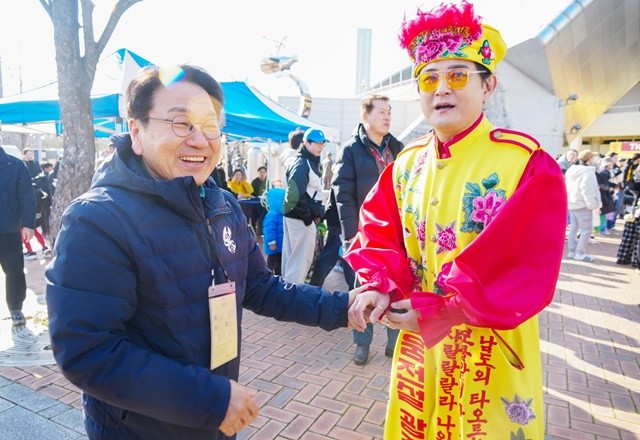 강기정 광주광역시장이 7일 오후 광주월드컵경기장에서 열린 광주FC와 인천 유나이티드의 2026시즌 K리그1 홈 개막전에 참석해 광주FC 홍보대사인 가수 조빈과 인사를 나누고 있다./광주광역시 제공