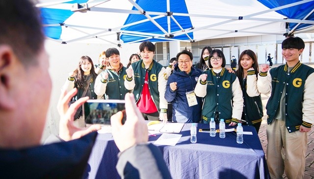 강기정 광주광역시장이 7일 오후 광주월드컵경기장에서 열린 광주FC와 인천 유나이티드의 2026시즌 K리그1 홈 개막전에 참석해 자원봉사 중인 대학생들을 격려하고 있다./광주광역시 제공