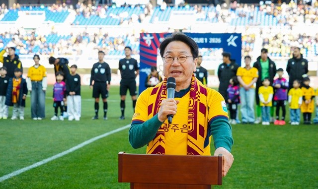 강기정 광주광역시장이 7일 오후 광주월드컵경기장에서 열린 광주FC와 인천 유나이티드의 2026시즌 K리그1 홈 개막전에 참석해 개막선언을 하고 있다./광주광역시 제공